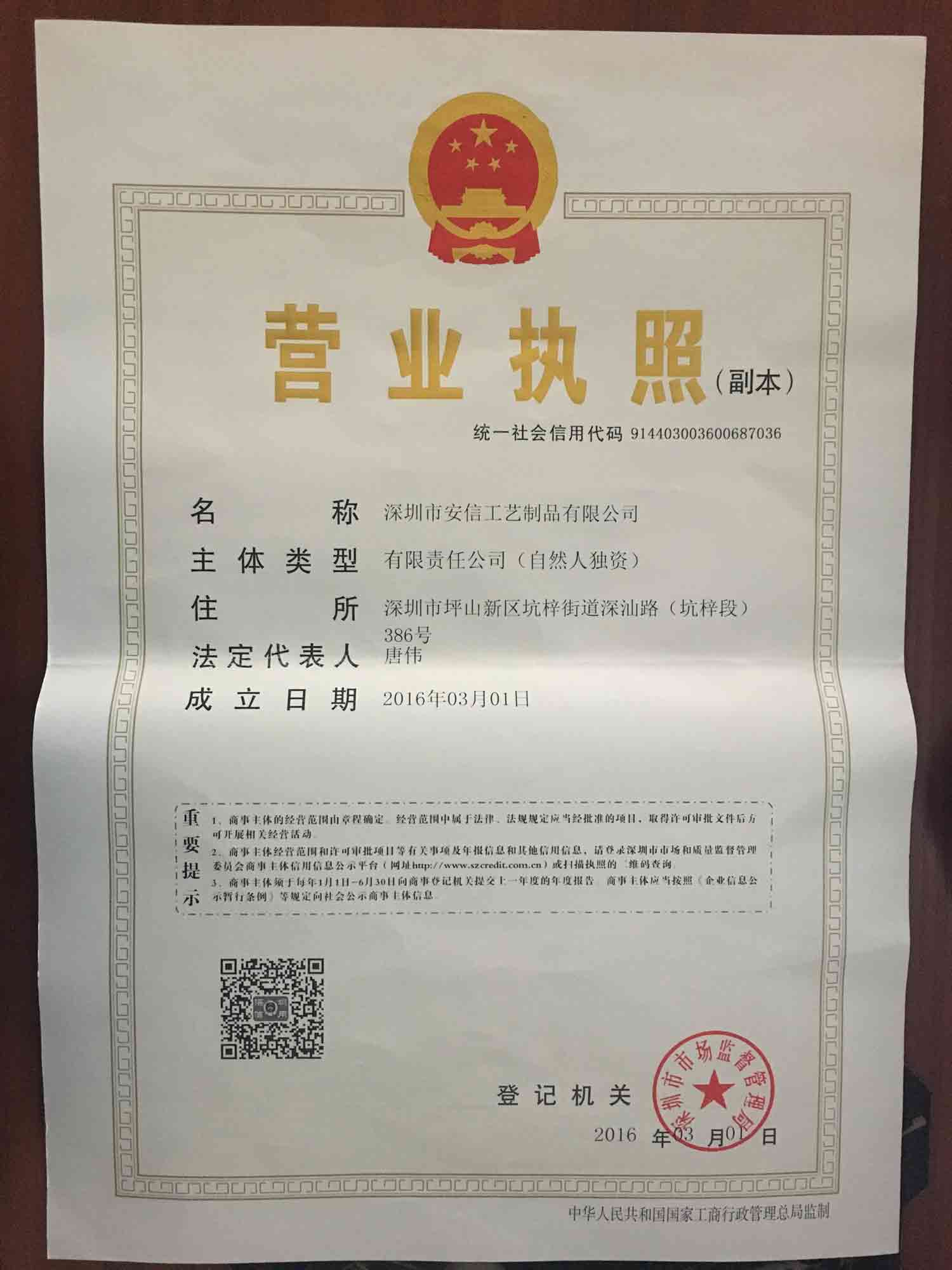 深圳市安信工艺制品有限公司 地址:广东省深圳市坪山新区坑梓镇同富裕工业区 座机 :0755-23250575 电话 :13570895213唐生 QQ:3334855070(微信同号)